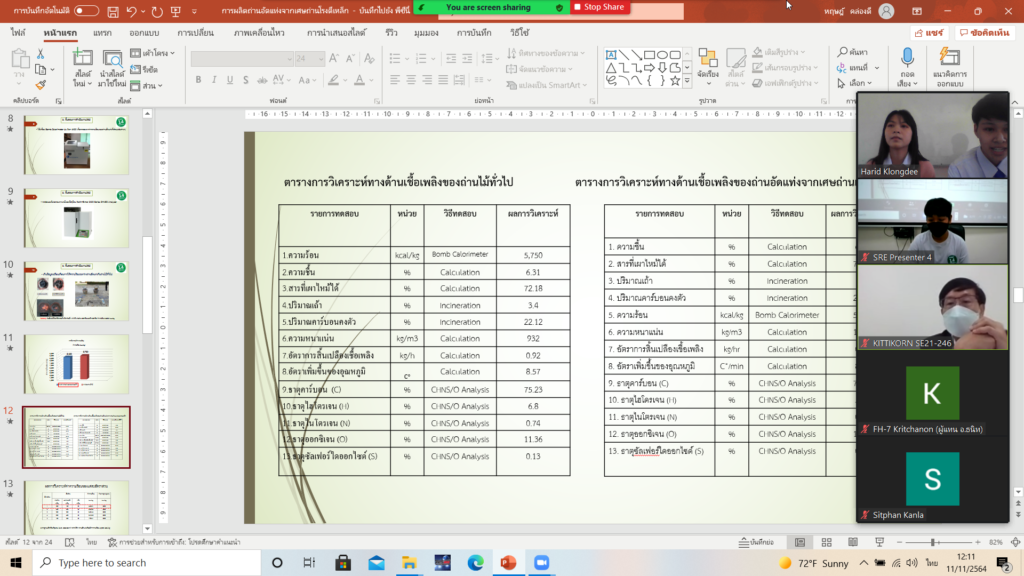 นักศึกษาชั้นปีที่ 4 เข้าร่วมนำเสนอผลงานวิจัย งานประชุมสัมมนาวิชาการรูปแบบพลังงานทดแทนสู่ชุมชนแห่งประเทศไทย ครั้งที่ 14 วันที่ 10-12 พฤศจิกายน 2564 ซึ่งจัดโดย วิทยาลัยพลังงานทดแทน มหาวิทยาลัยแม่โจ้ จังหวัดเชียงใหม่ จำนวน 2 บทความ ในรูปแบบออนไลน์ โดยมีรายละเอียดดังต่อไปนี้