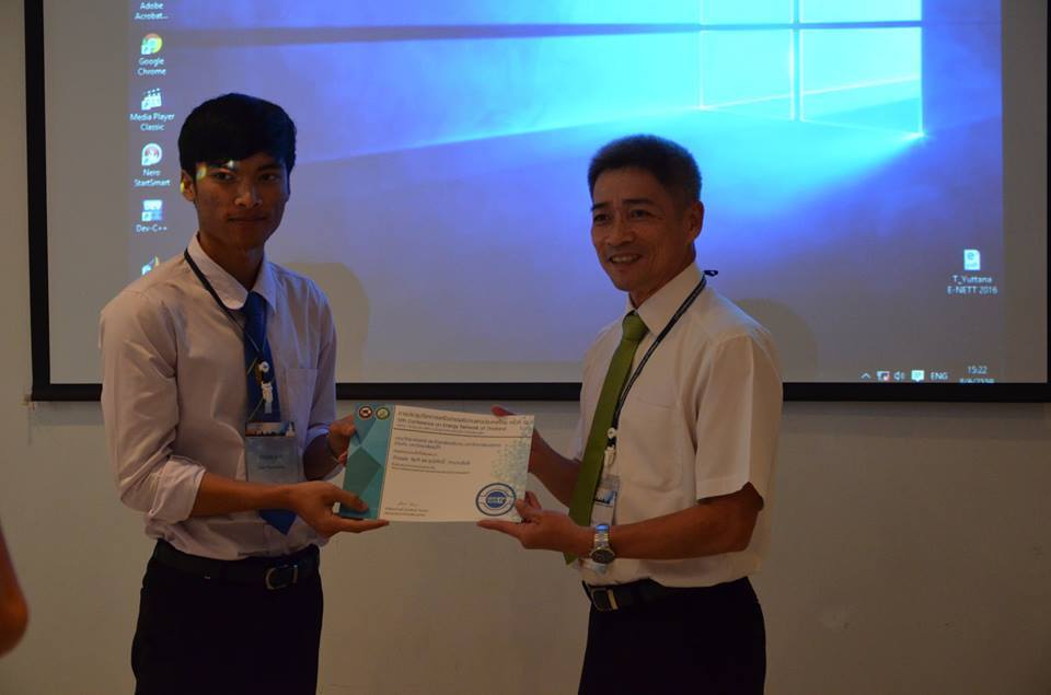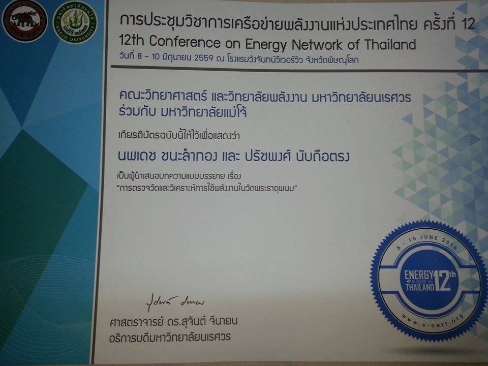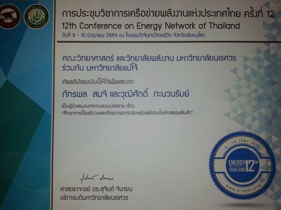 การประชุมวิชาการเครือข่ายพลังงานแห่งประเทศไทยครั้งที่ 12 การนำเสนอผลงานวิชาการในเวทีการประชุมวิชาการเครือข่ายพลังงานแห่งประเทศไทยครั้งที่ 12 ณ โรงแรมวังจันทร์ริเวอร์วิว จังหวัดพิษณุโลก 8-10 มิถุนายน 2559 มีผลงานนักศึกษา 2 ผลงานประกอบด้วย1.นายภัทรพล สมจี ในผลงานวิจัยเรื่อง การศึกษาการใช้พลังงานและศักยภาพการประหยัดพลังงานในห้างสรรพสินค้า2.นายนพเดช ชนะลำทอง ในผลงานวิจัยเรื่อง การตรวจวัดและวิเคราะห์การใช้พลังงานในวัดพระธาตุพนม