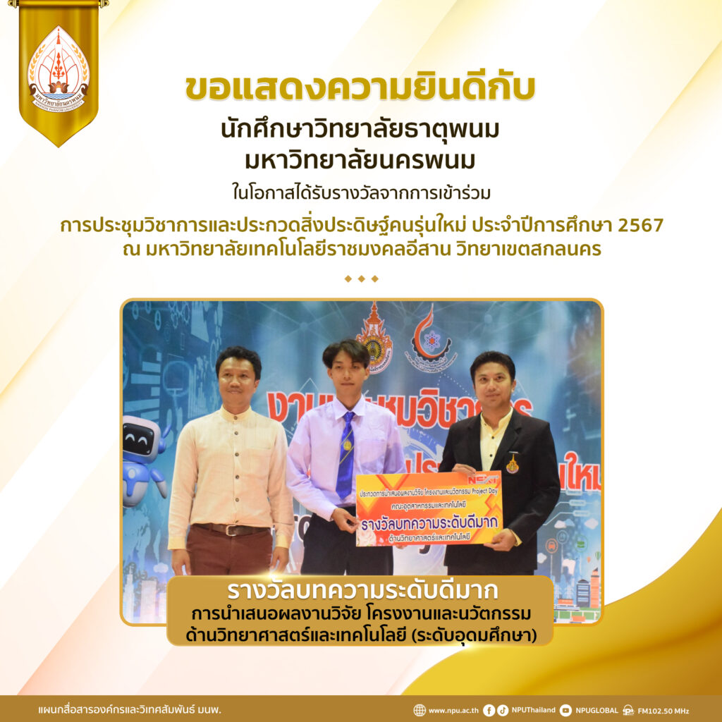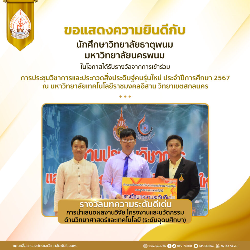 นักศึกษาสาขาวิชาวิศวกรรมพลังงาน คว้ารางวัลบทความดีเด่นและบทความดีมากในการประชุมวิชาการและประกวดสิ่งประดิษฐ์คนรุ่นใหม่ ประจำปี 2567 ในวันที่ 26 กรกฎาคม 2567 ณ มหาวิทยาลัยเทคโนโลยีราชมงคลอีสาน วิทยาเขตสกลนคร ประกอบด้วย