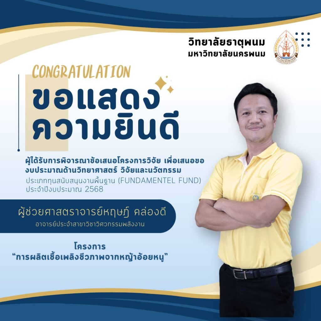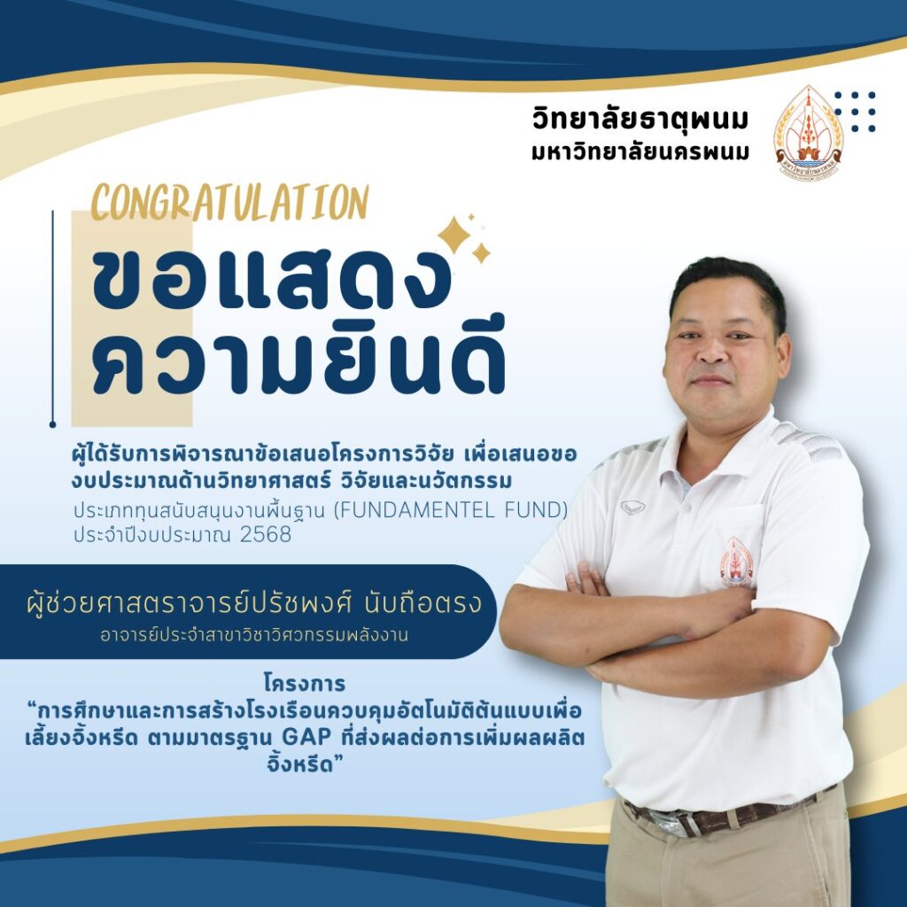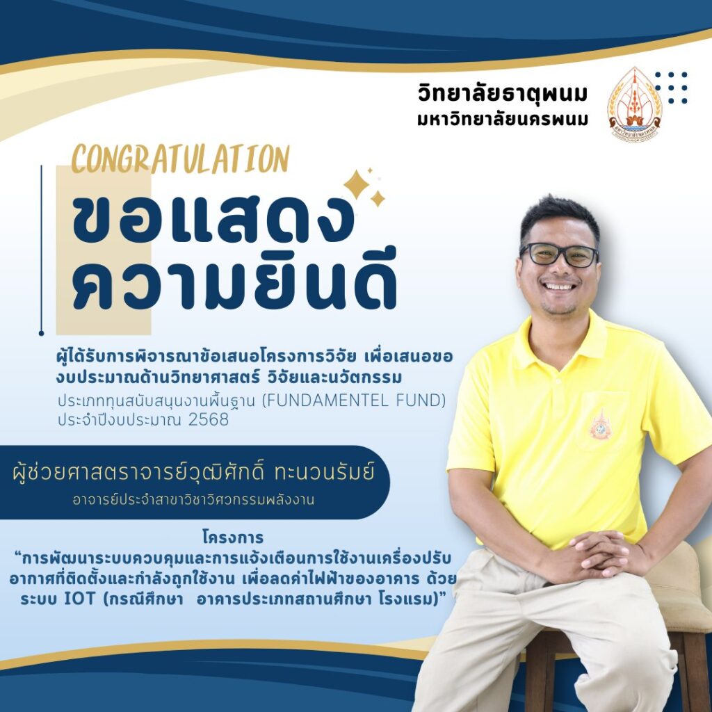 อาจารย์ประจำสาขาวิชาวิศวกรรมพลังงาน ไดัรับการพิจารณาข้อเสนอโครงการวิจัยเพื่อเสนอของบประมาณด้านวิทยาศาสตร์ วิจัยและนวัตกรรม ประเภททุนสนับสนุนงานพื้นฐาน (Fundamentel Fund) ประจำปีงบประมาณ 2568 จำนวน 3 โครงการประกอบด้วย1. ผู้ช่วยศาสตราจารย์หฤษฎ์ คล่องดี ในโครงการ “การผลิตเชื้อเพลิงชีวภาพจากหญ้าอ้อยหนู”2. ผู้ช่วยศาสตราจารย์ปรัชพงศ์ นับถือตรง ในโครงการ “การศึกษาและการสร้างโรงเรือนควบคุมอัตโนมัติต้นแบบเพื่อเลี้ยงจิ้งหรีด ตามมาตรฐาน GAP ที่ส่งผลต่อการเพิ่มผลผลิตจิ้งหรีด”3. ผู้ช่วยศาสตราจารย์วุฒิศักดิ์ ทะนวนรัมย์ ในโครงการ “การพัฒนาระบบควบคุมและการแจ้งเตือนการใช้งานเครื่องปรับอากาศที่ติดตั้งและกำลังถูกใช้งาน เพื่อลดค่าไฟฟ้าของอาคาร ด้วยระบบ IOT (กรณีศึกษา อาคารประเภทสถานศึกษา โรงแรม)เครดิตภาพ : งานประชาสัมพันธ์ วิทยาลัยธาตุพนม มหาวิทยาลัยนครพนม