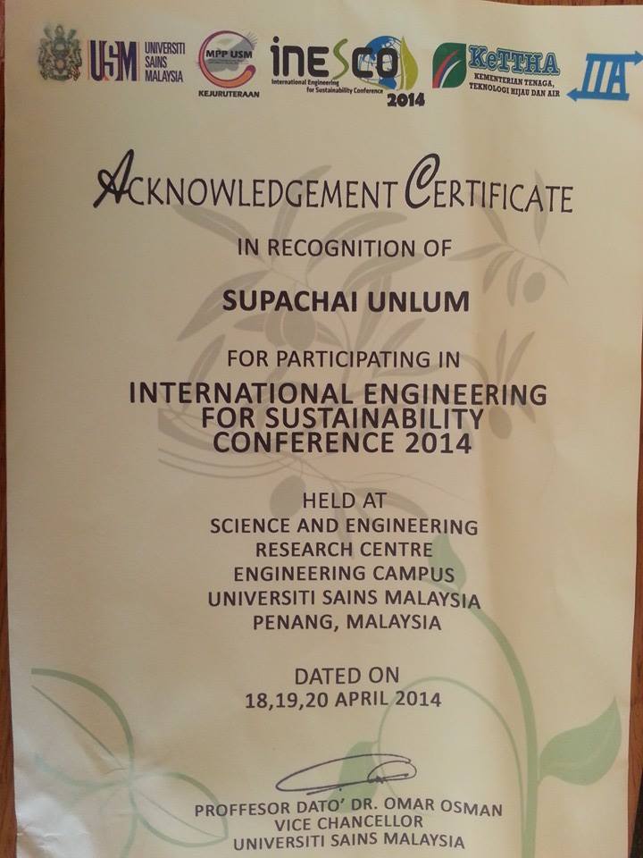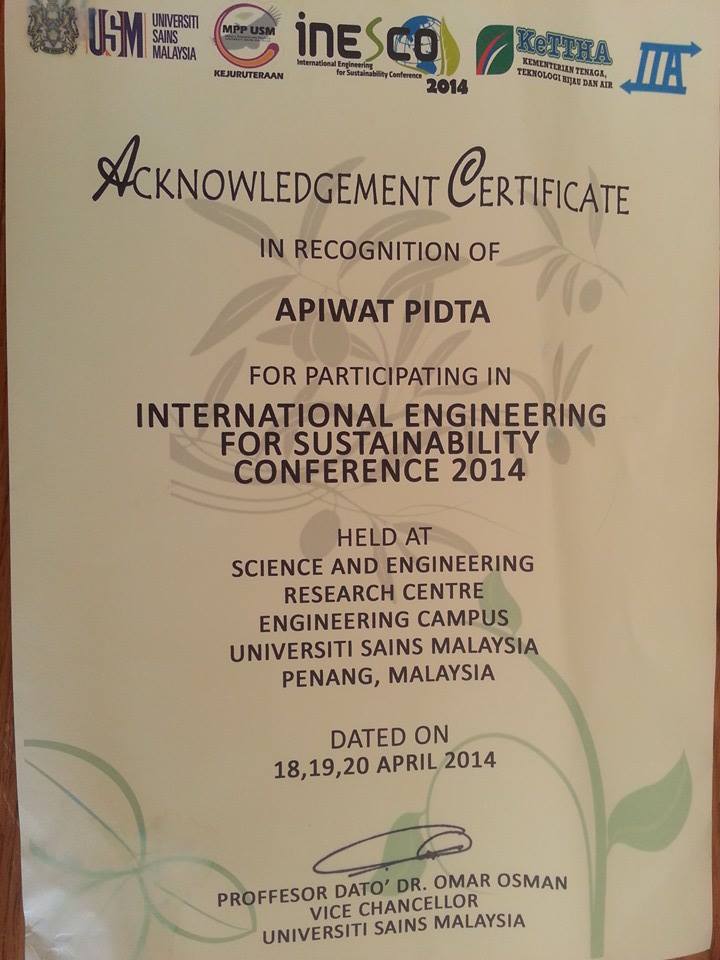 นักศึกษาสาขาวิชาเทคโนโลยีพลังงาน 2 คน ได้รับคัดเลือกให้เข้าร่วมเสนอผลงานวิชาการระดับนานาชาติ International Engineering for Sustainability Conference 2014 (iNESCO 2014) ที่ มหาวิทยาลัย UNIVERSITY SAINS MALAYSIA(USM) ประเทศมาเลเซีย ระหว่างวันที่ 18-20 เมษายน 2557